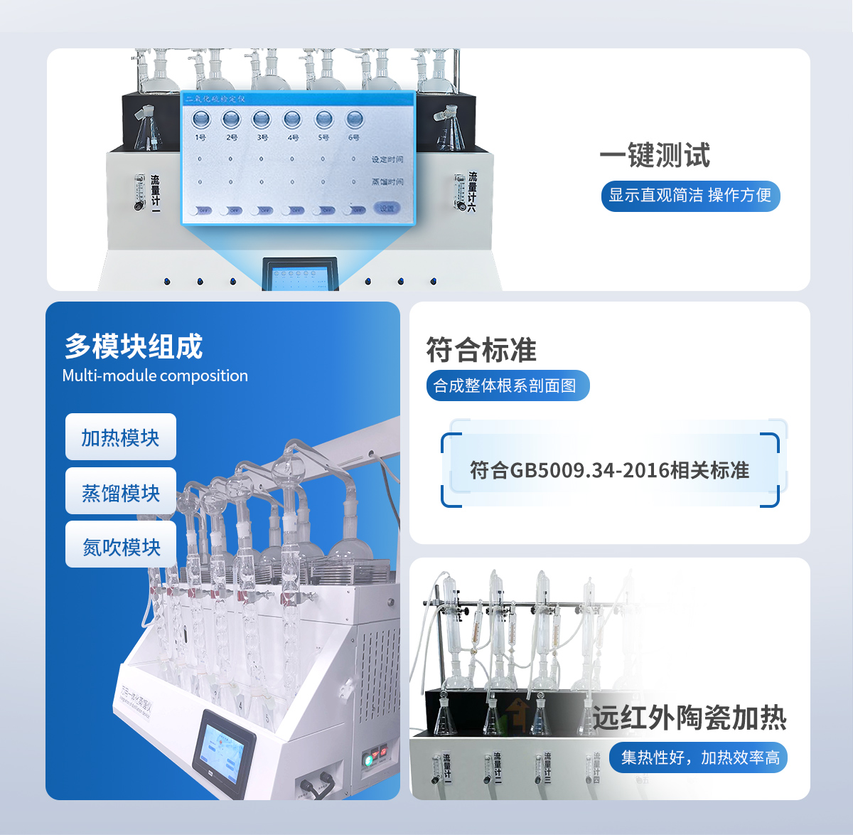 中藥二氧化硫殘留量測定儀主要由加熱模塊,蒸餾模塊,冷卻循環(huán)水模塊以及氮吹模塊組成。加熱模塊設置了高,中,低三檔加熱速率控制功能,可實現加熱效率的**控制面板;蒸餾模塊選用高硼硅材料,耐熱性好,堅固耐用;冷卻水循環(huán)系統(tǒng)可選用外置冷卻水循環(huán)機(內置可選),確保冷卻效果。氮吹模塊可外接氮氣發(fā)生器或氮氣鋼瓶,并配有高精度氣體流量計,嚴格控制氮吹速率
