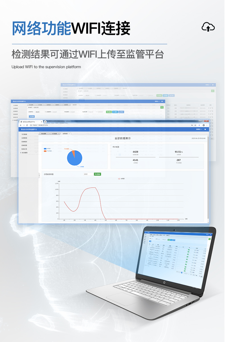 12、儀器具有 wifi 聯(lián)網(wǎng)上傳、RJ45網(wǎng)線連接功能,可以快速上傳數(shù)據(jù)。同步對(duì)接監(jiān)管平臺(tái),數(shù)據(jù)可局域網(wǎng)和互聯(lián)網(wǎng)數(shù)據(jù)上傳,檢測(cè)結(jié)果直接傳至食品安全監(jiān)管平臺(tái)。進(jìn)行區(qū)域食品安全監(jiān)管及大數(shù)據(jù)分析處理與數(shù)據(jù)統(tǒng)計(jì),檢測(cè)區(qū)域食品安全長(zhǎng)短期動(dòng)態(tài),達(dá)到食品安全問(wèn)題預(yù)估、預(yù)警。