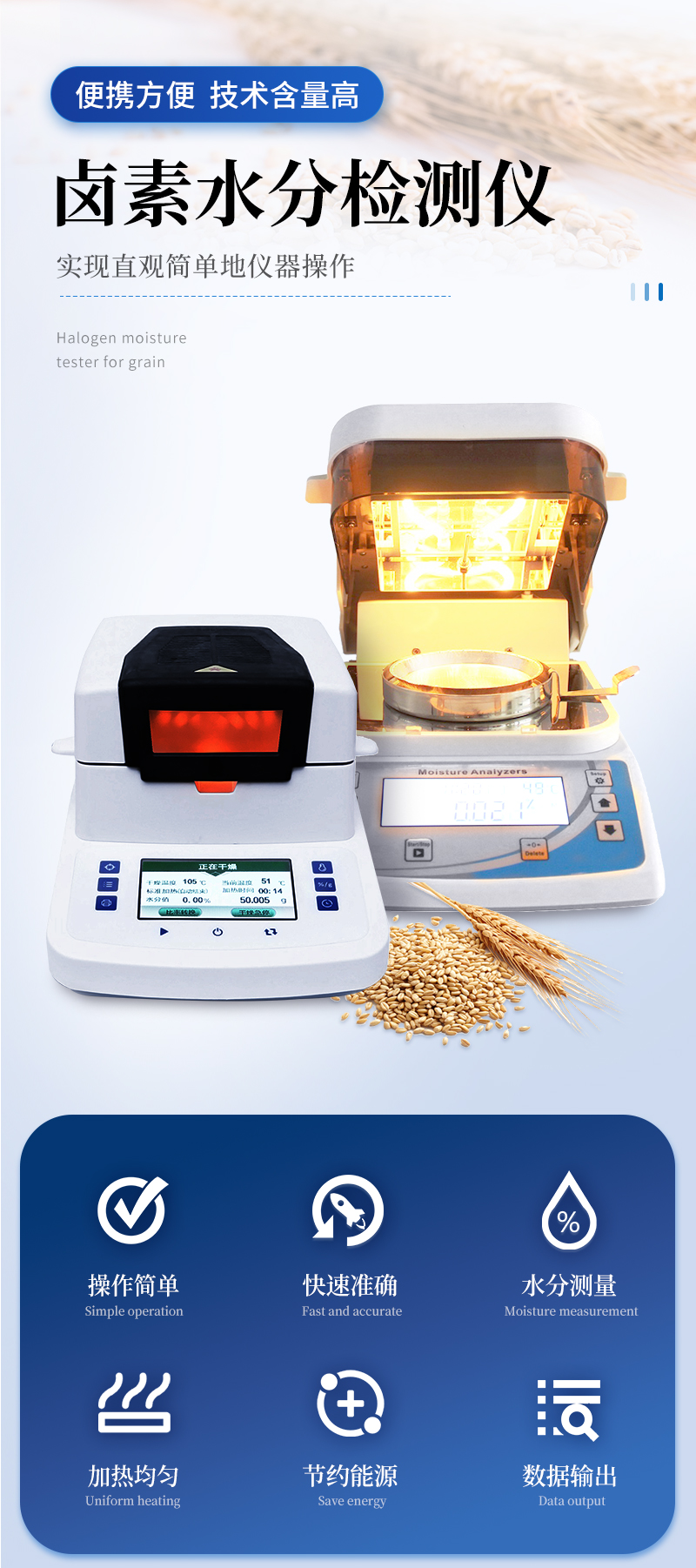 該系列快速水分測定儀應用了國際烘箱干燥法原理,測定結果與烘箱法水分測定具有良好的一致性,工作效率卻遠遠高于烘箱法水分測定,一般樣品只需要幾分鐘即可測量完畢,因此受到廣大用戶的青睞與好評。