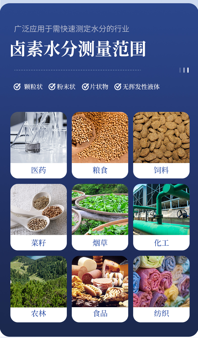 該系列快速水分測定儀應用于一切需要快速測定水分的行業,只要是顆粒狀、粉末狀、片狀物、無揮發性液體均可測量,如:糧食、化工、醫藥、塑膠原料、橡膠、煙草、茶葉、紡織、肉類、食品、淀粉、飼料、煤炭、型砂、污水污泥、乳業等等;