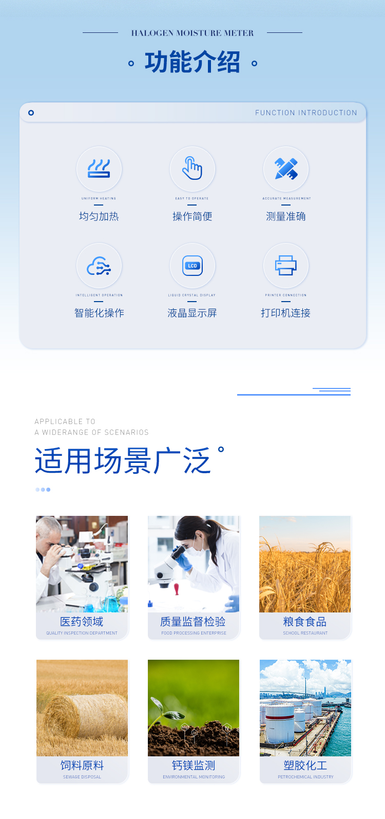 鹵素水分測(cè)定儀用于如:醫(yī)藥、塑膠、化工、食品、糧食、飼料、鈣鎂、質(zhì)量監(jiān)督檢驗(yàn)、等各行業(yè)中的生產(chǎn)過與實(shí)驗(yàn)過程中, 具有良好重··· 熱線:133-7109-8225