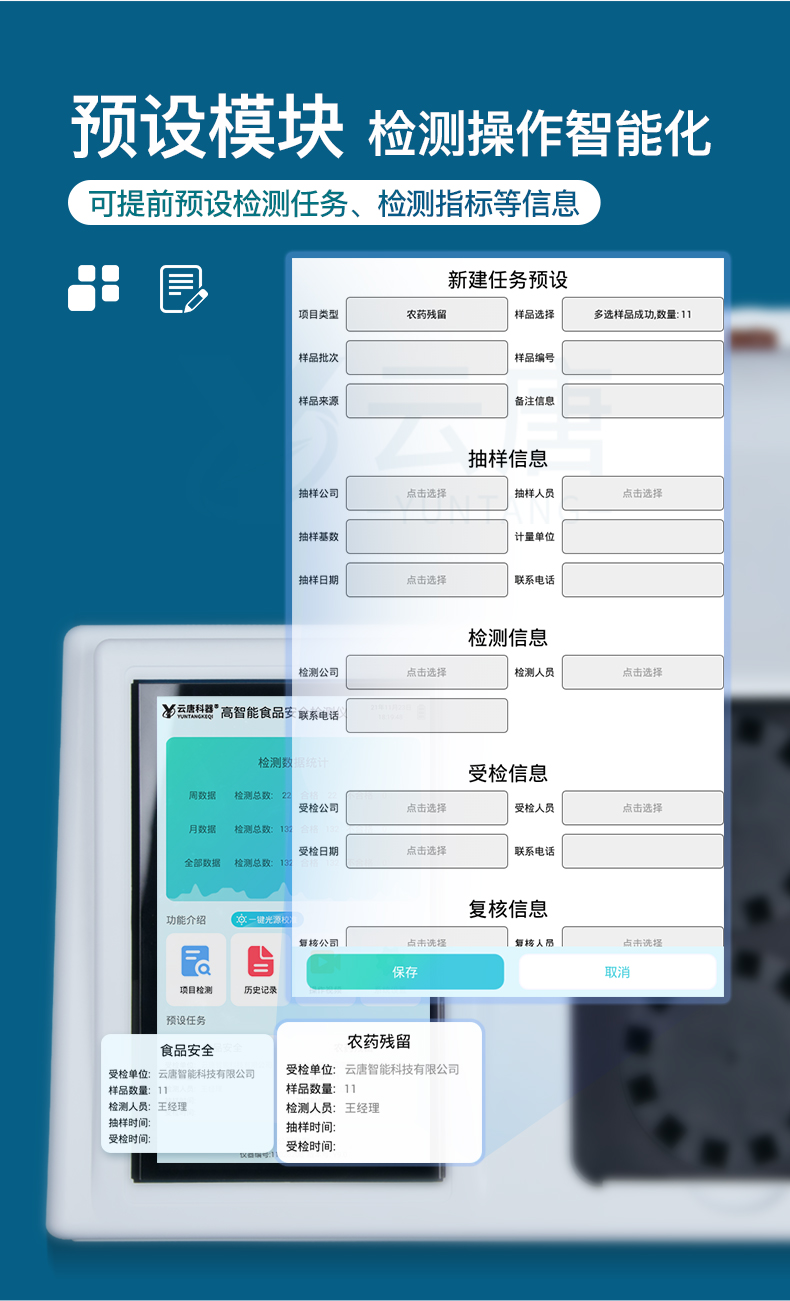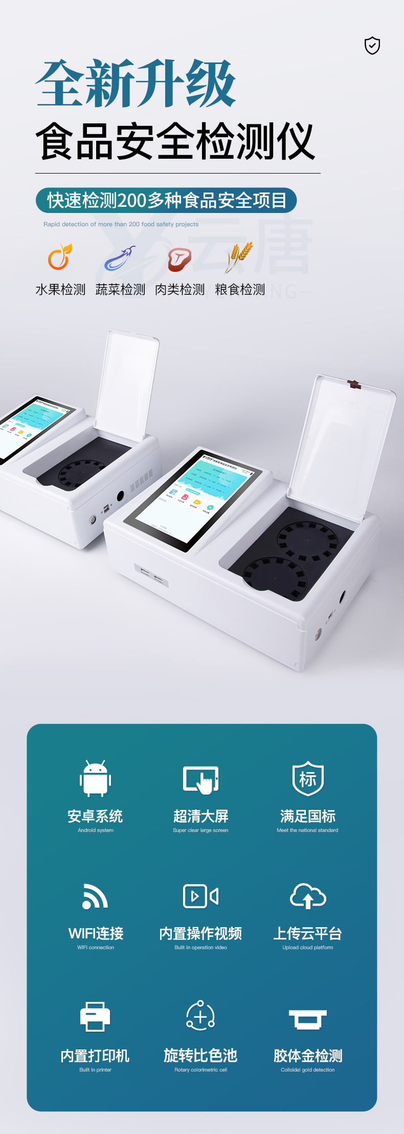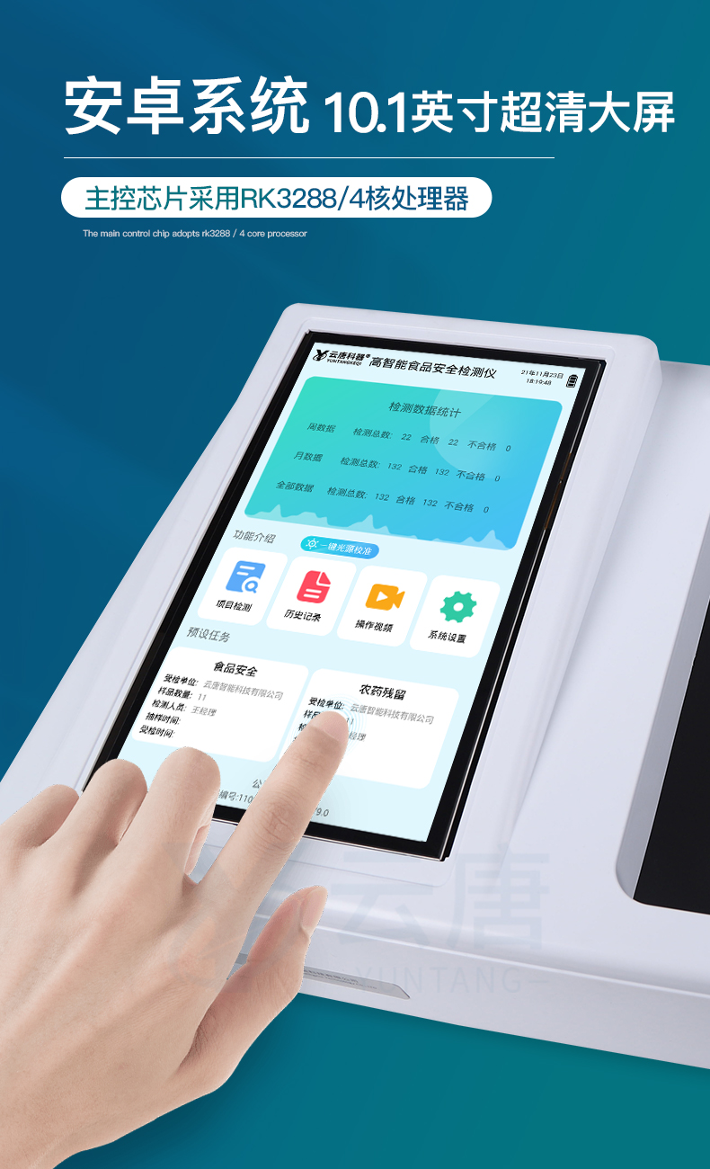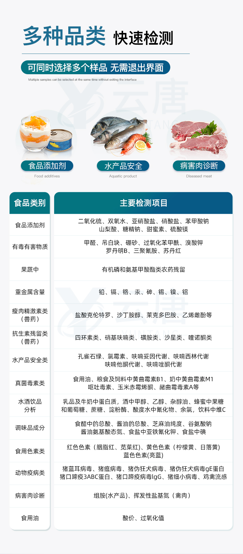 山東云唐智能科技有限公司生產的食品安全綜合分析儀為集成化食品安全快速檢測分析設備,采用臺式一體化設計,可快速檢測200多種食品安全項目,包含非食用化學物質、濫用食品添加劑、農藥殘留、獸藥殘留、重金屬、病害肉、營養強化劑、抗生素類殘留、激素類殘留、真菌毒素類殘留、化學類殘留等項目的定性定量檢測。