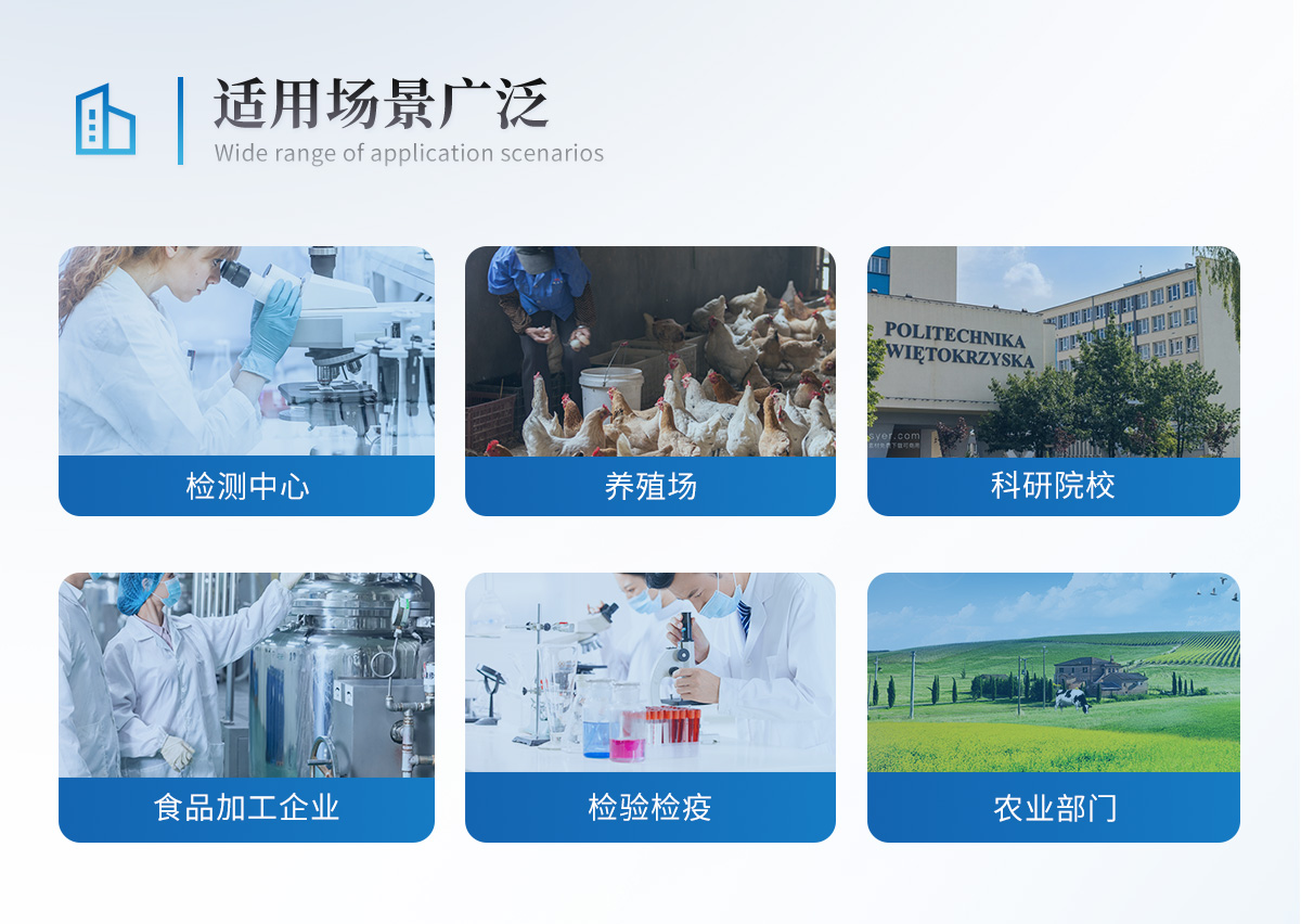 該獸藥殘留檢測儀為集成化食品安全快速檢測分析設(shè)備,目前已于食藥監(jiān)局、衛(wèi)生部門、高教院校、科研院所、農(nóng)業(yè)部門、養(yǎng)殖場、屠宰場、食品肉產(chǎn)品深加工企業(yè)及檢驗檢疫部門等單位廣泛使用。